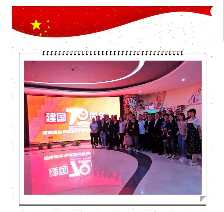 为隆重庆祝中华人民共和国成立70周年,弘扬爱国主义精神,激发党员干部、销售业务经理等职工的爱党爱国热情,并结合 “不忘初心,牢记使命”主题教育活动安排,10月5日,我公司组织党员干部、入党积极分子、销售经理等观看爱国电影《我和我的祖国》。