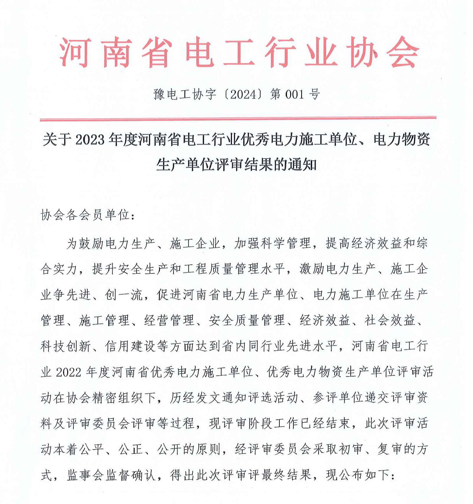 为鼓励电力生产、施工企业,加强科学管理,提高经济效益和综合实力,提升安全生产和工程质量管理水平河南省电工行业协会开启了2023年度河南省优秀电力施工单位、优秀电力物资生产单位评审活动。