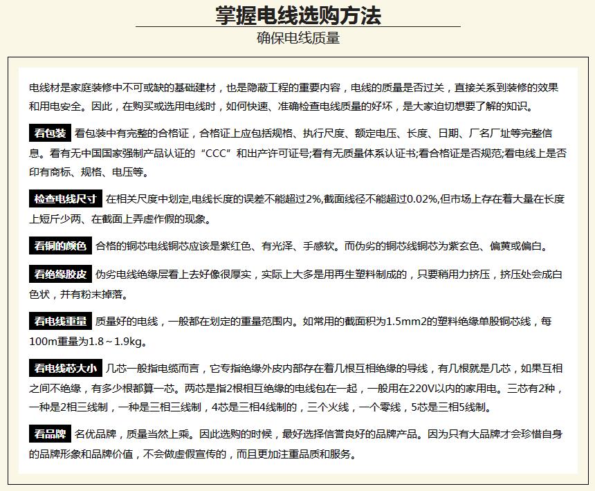 【概要描述】随着生活水平的大幅提升和家用电器的增多,人们对用电量的需求日益增大,电线的使用量也随之增加。电线虽小责任却重大,它是家庭装修中不可缺少的基础建材,电线质量是否过关,直接关系着家装的电路安全。需知许多火灾、触电事故都是由于电线线路质量低劣引起的。因此,在家庭装修的时候,选择电线一定不能轻心大意。电线选购第一步了解电线小常识电线用以输电(磁)能、信息和实现电磁能转换的线材产品。家庭装修时,电线是不可缺