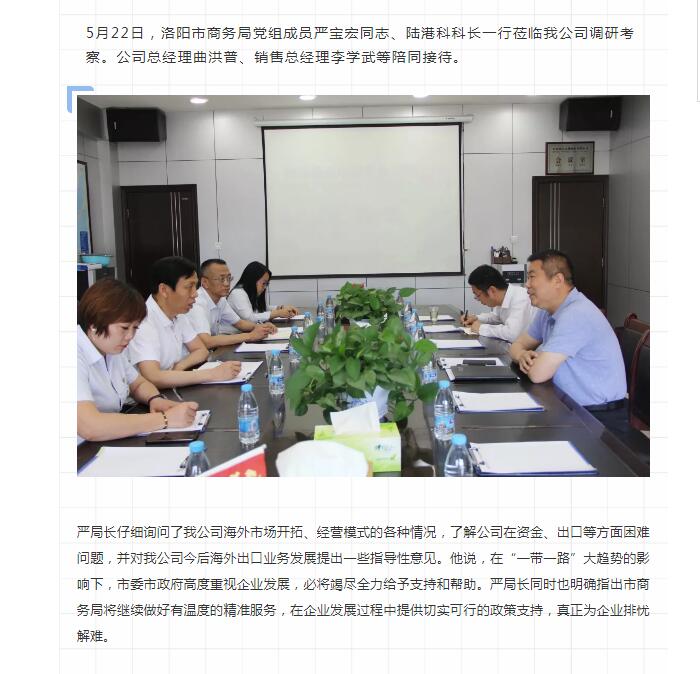 【概要描述】5月22日,洛阳市商务局党组成员严宝宏同志、陆港科科长一行莅临我公司调研考察。公司总经理曲洪普、销售总经理李学武等陪同接待。